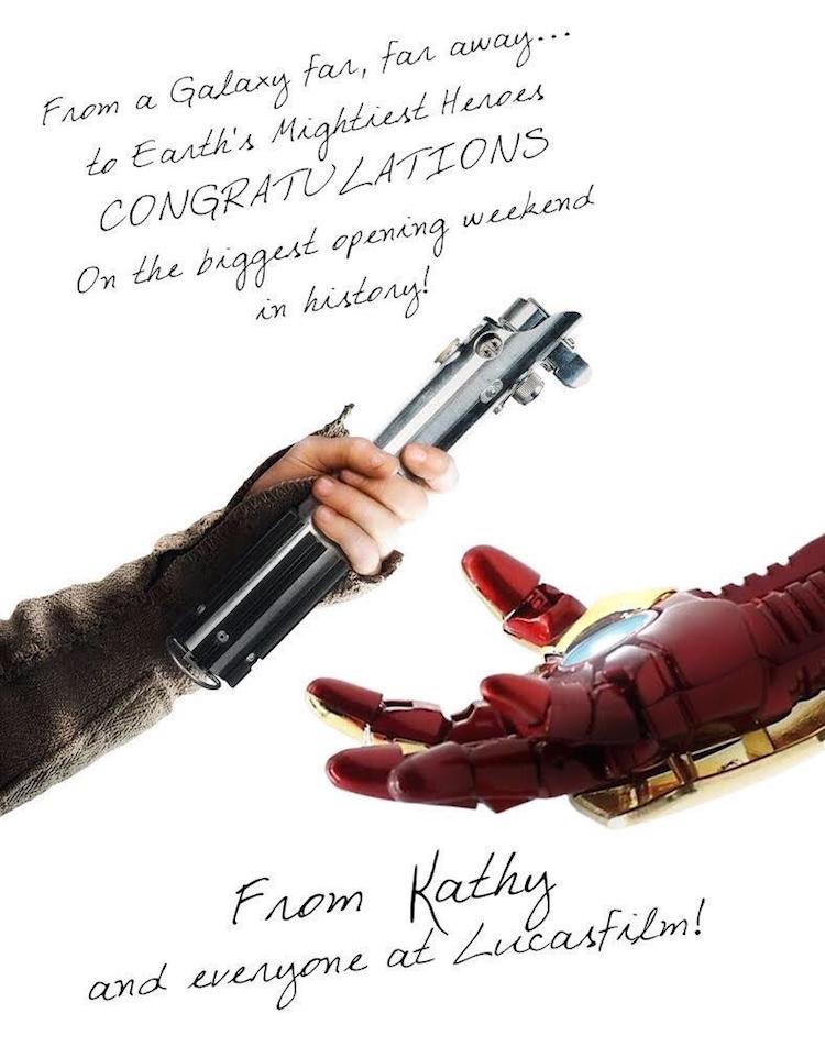 Jumping into the 21st century, The Avengers, in 2012, took the record for biggest opening weekend away from Star Wars and at the same time re-invigorated the tradition of passing congratulations. Although this time the director didn’t take ad space in a newspaper, but instead spread the image across social media, for a global audience to see.