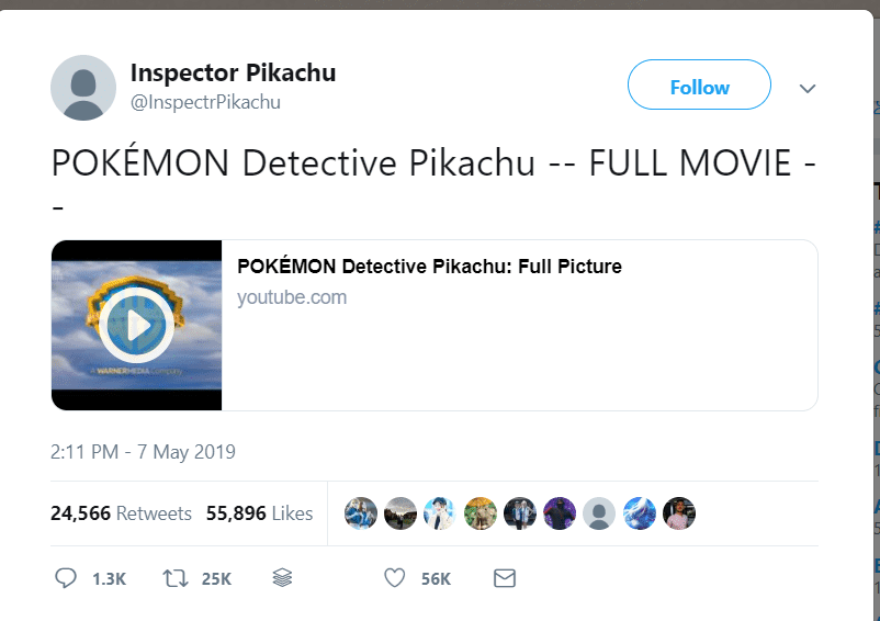 The most recent video was released just before the premiere of the film. The joke twitter account called Inspector Pikachu was made to look like a new account, with no profile picture. The tweet was then re-tweeted by Ryan Reynolds and thus, see by the masses. As of writing this the tweet has 55,896 likes and 24,566 retweets.